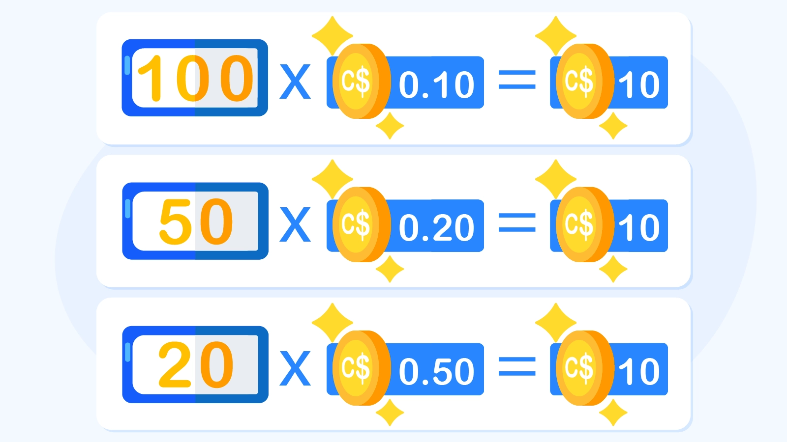 - 50 bonus rounds × C$0.20 = C$10 total value